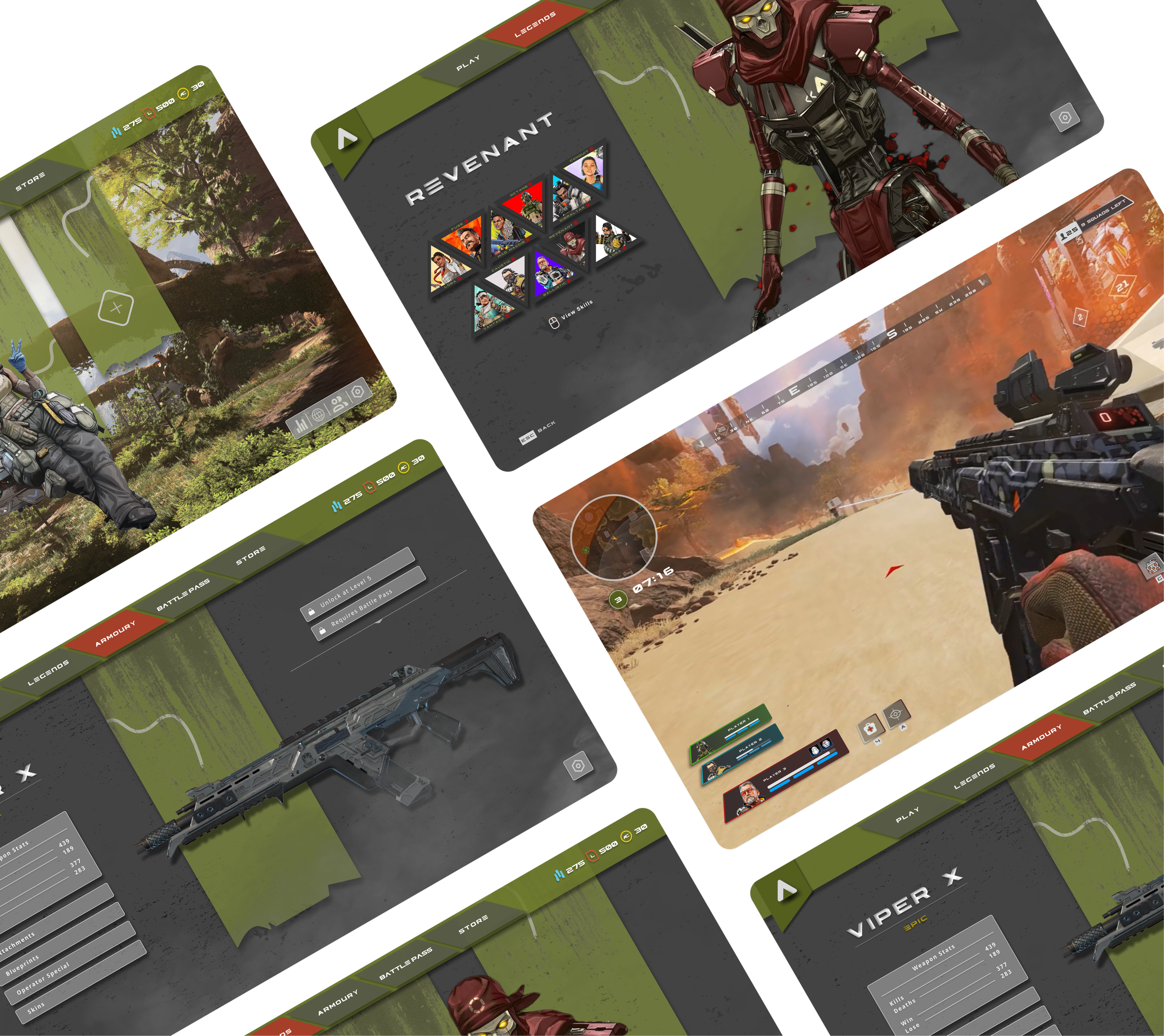 The redesign of the Apex Legends GUI will implement an earthy and nature-themed aesthetic that enhances visual appeal and user experience. By utilizing organic color palettes, natural textures, and intuitive layout adjustments, the new interface will create a more immersive environment for players. Key features will include improved navigation elements, clearer visual hierarchies, and streamlined information display, ensuring players can focus on gameplay while feeling more connected to the game’s world.