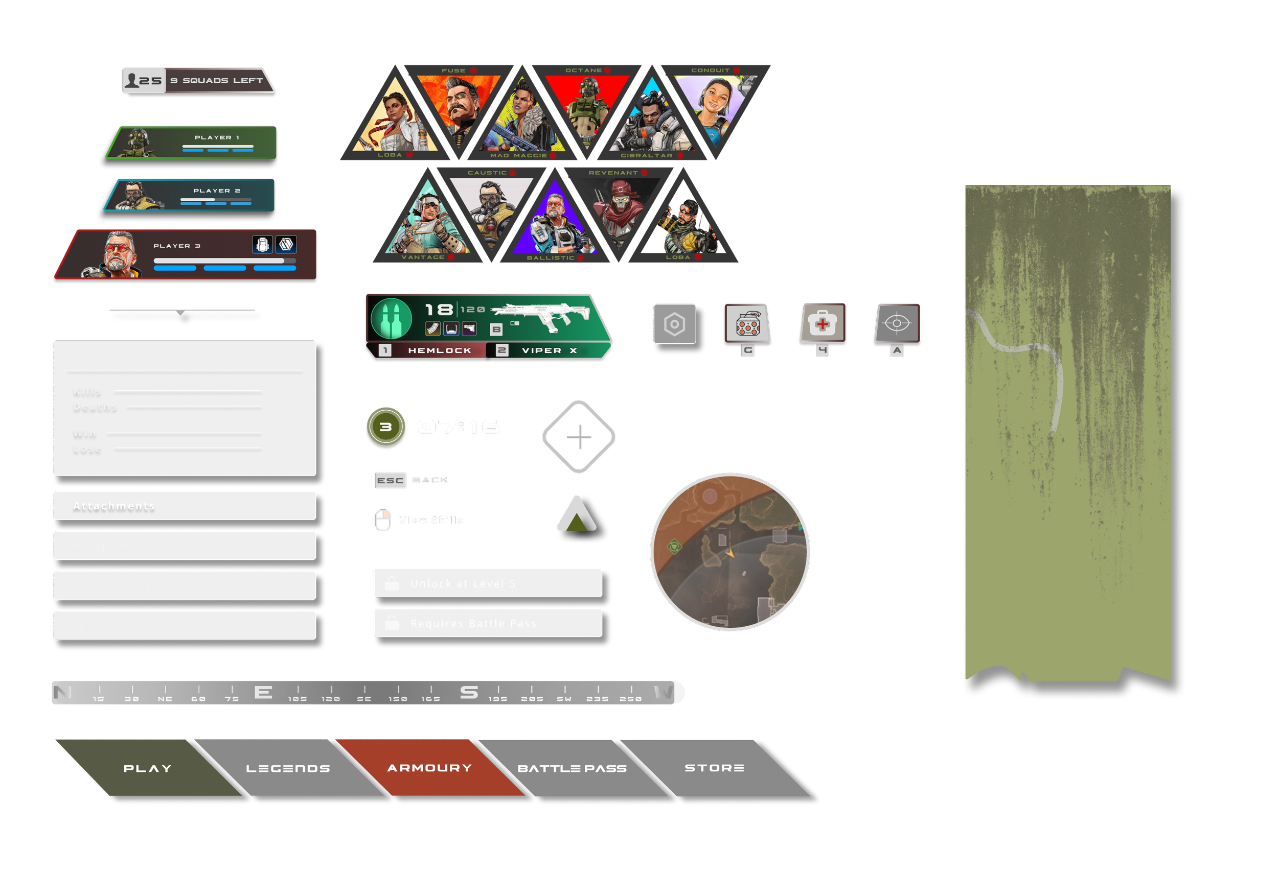This UI kit was crafted as part of my Apex Legends redesign, featuring a custom set of icons and logos that bring an earthy, nature-inspired aesthetic to the game's interface. Each element is designed to enhance the visual appeal and maintain clarity in high-action moments, creating a cohesive and immersive user experience that aligns with the game’s rugged, adventurous tone.