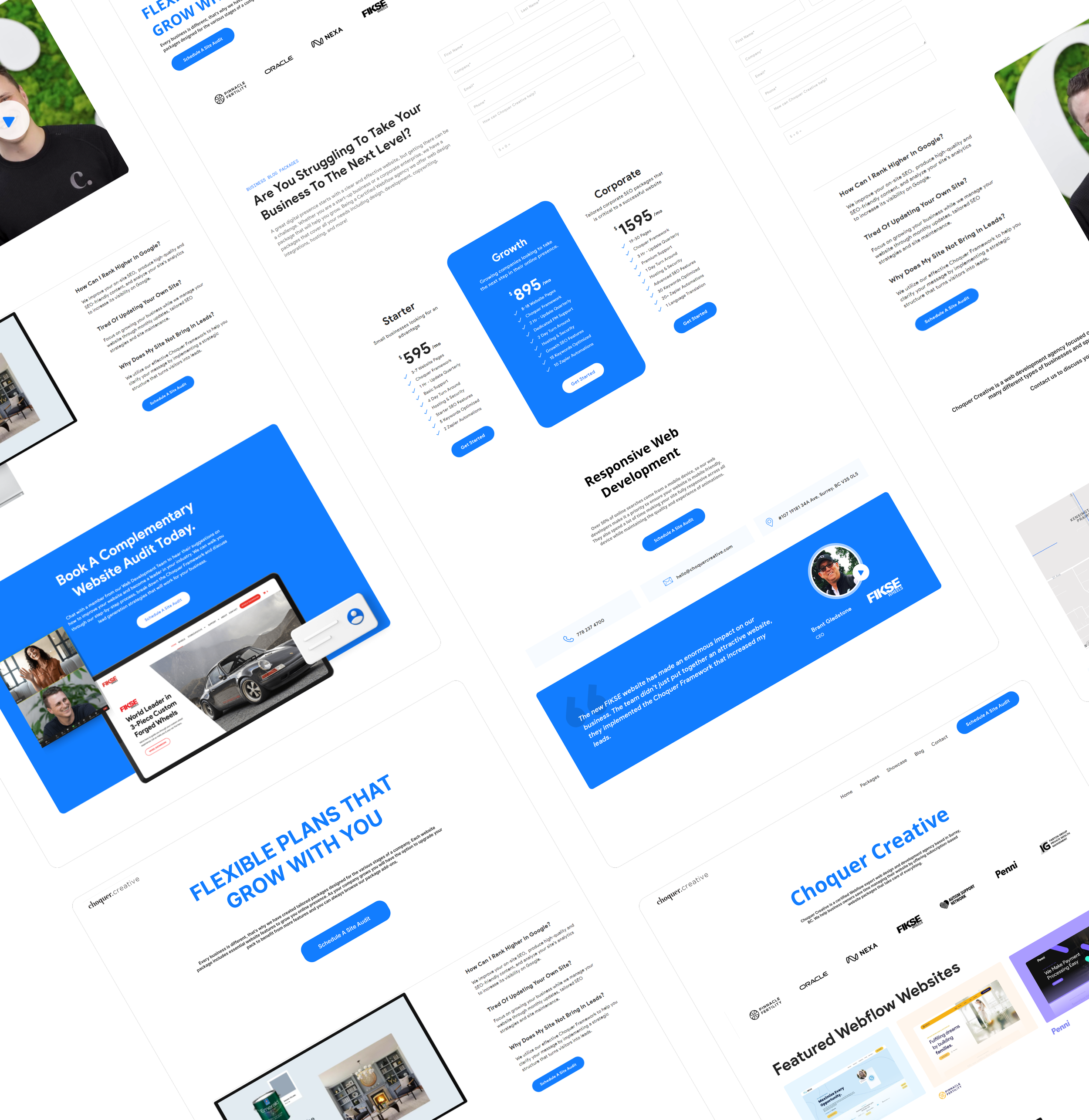 The final design for Choquer Creative’s landing page features a sleek, modern look with a royal blue as the primary accent, adding a touch of sophistication and brand cohesion. With clean, intuitive navigation and strategically placed ETA buttons, the interface ensures a smooth and engaging user experience. Essential services and information are just a click away, fostering a seamless connection with visitors and making each interaction feel both efficient and personalized.
